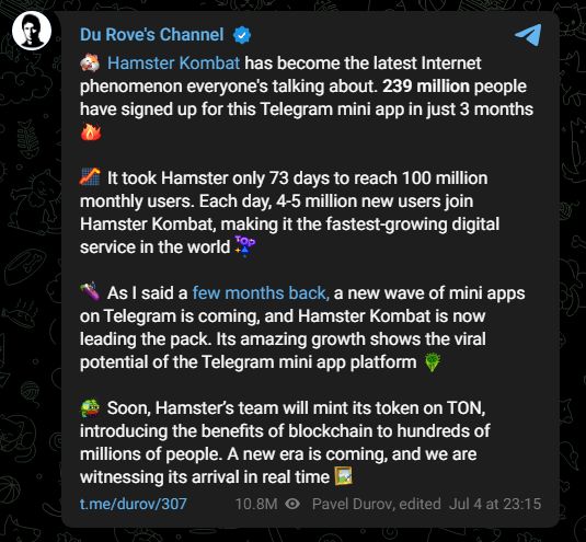Pavel Durov, Telegram’s CEO, additionally admired the undertaking, saying that it’s the fastest-growing digital service on-line and might change how we work together with the blockchain.
