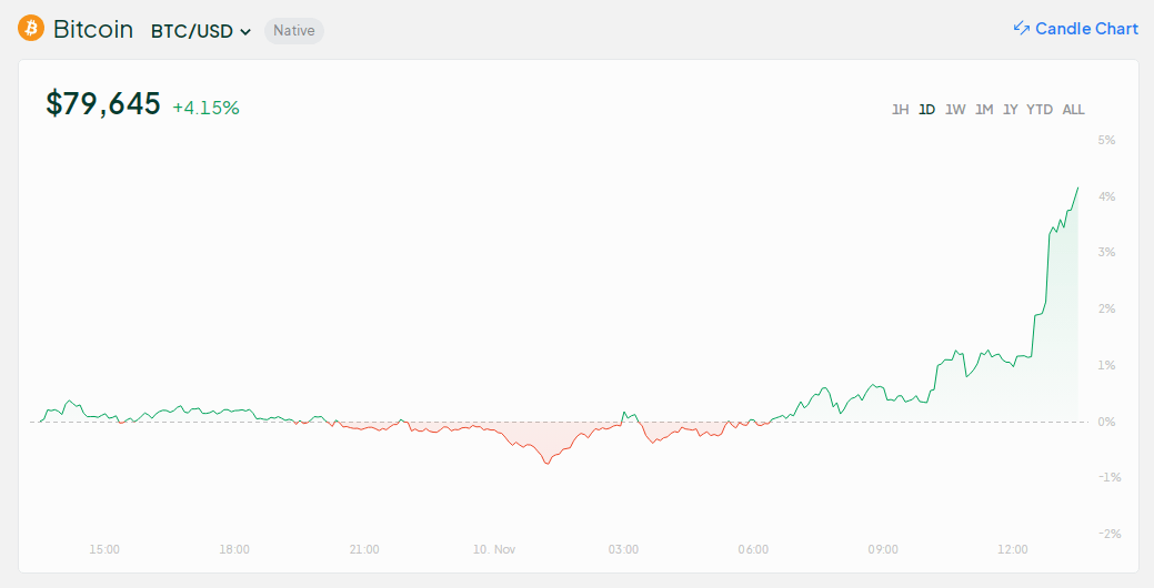 Instantly after the elections, Bitcoin unleashed one other mini-run, hitting $77,262 and briefly topping $79k for the primary time. With favorable market and political situations, many merchants and analysts are extra upside for Bitcoin.