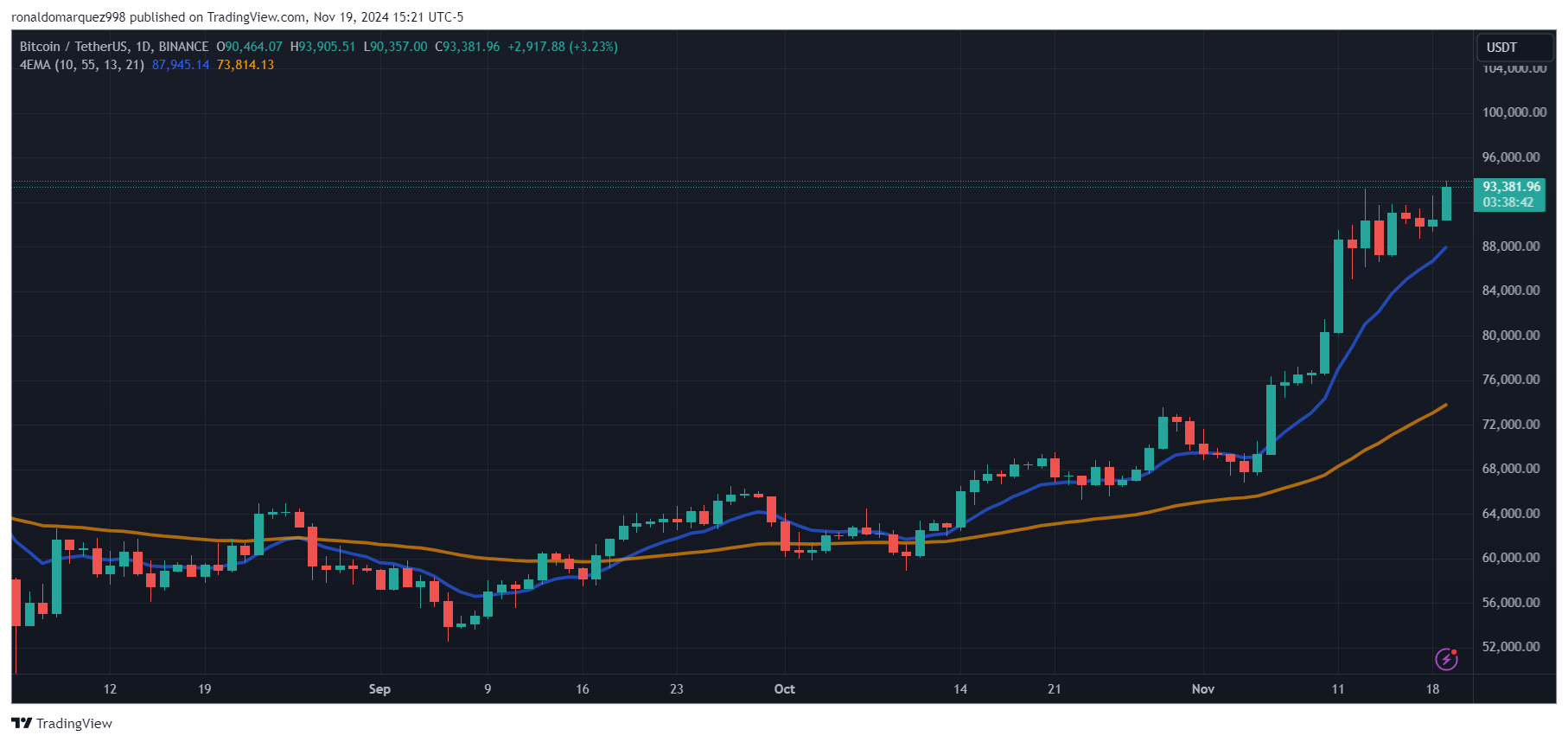 On the time of writing, BTC has fallen again to $93,380 after hitting its new all-time excessive, marking a 40% improve in simply two weeks.