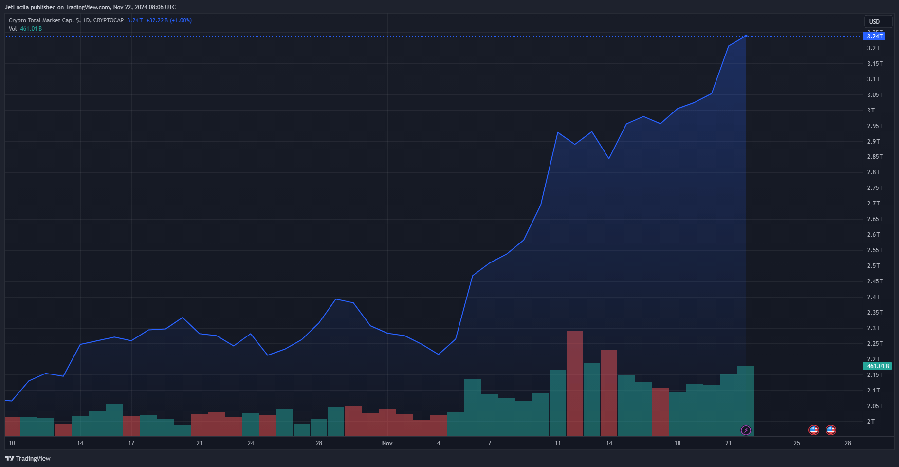 As of at this time, the market cap of cryptocurrencies reached $3.24 trillion. Chart: TradingView