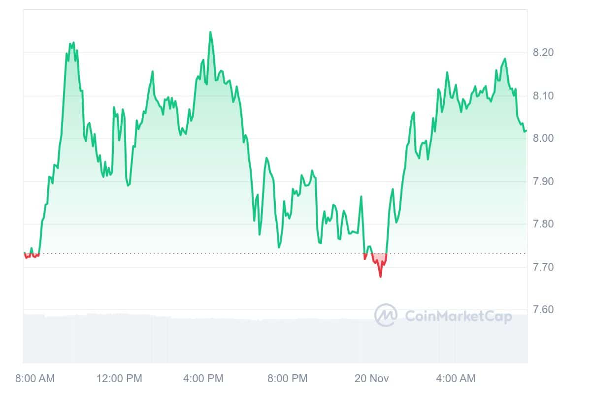 Render Token (RENDER) has achieved spectacular development, lately hitting a milestone of $8, marking a big improve of over 10x. Bullish projections recommend the token might climb even larger, with some analysts predicting an increase to $12.30 and potential surges to $22. Lengthy-term forecasts are much more optimistic, estimating that RENDER might attain as excessive as $150 on a logarithmic scale.