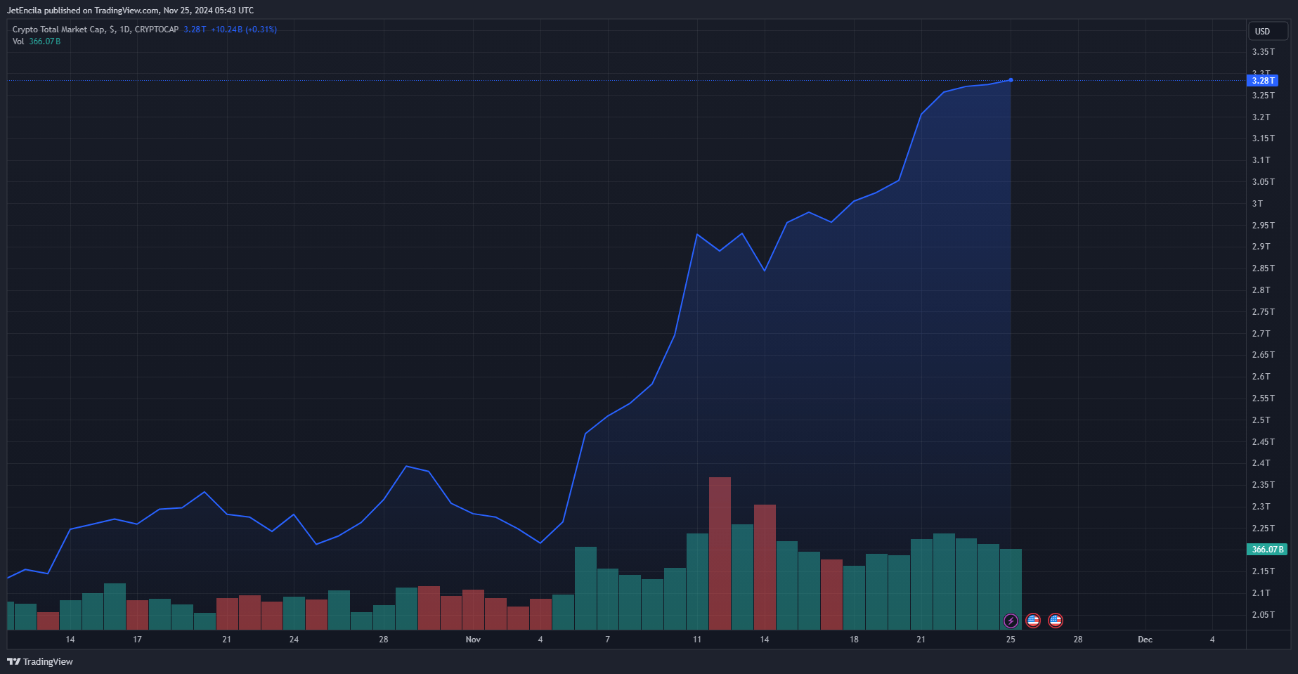 As of in the present day, the market cap of cryptocurrencies stood at $3.28 trillion. Chart: TradingView