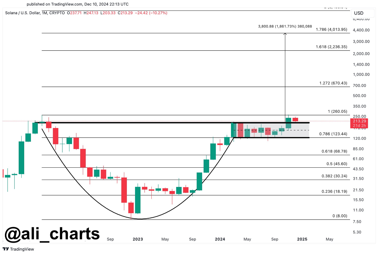 Nonetheless, forecasts of Solana’s eventual value range extensively. Impressed by the “cup and deal with” chart sample exhibiting on month-to-month charts, crypto analyst Ali Martinez thinks SOL would possibly attain $4,000. This optimistic framework suggests {that a} breach above $260 would trigger exponential enhance.
