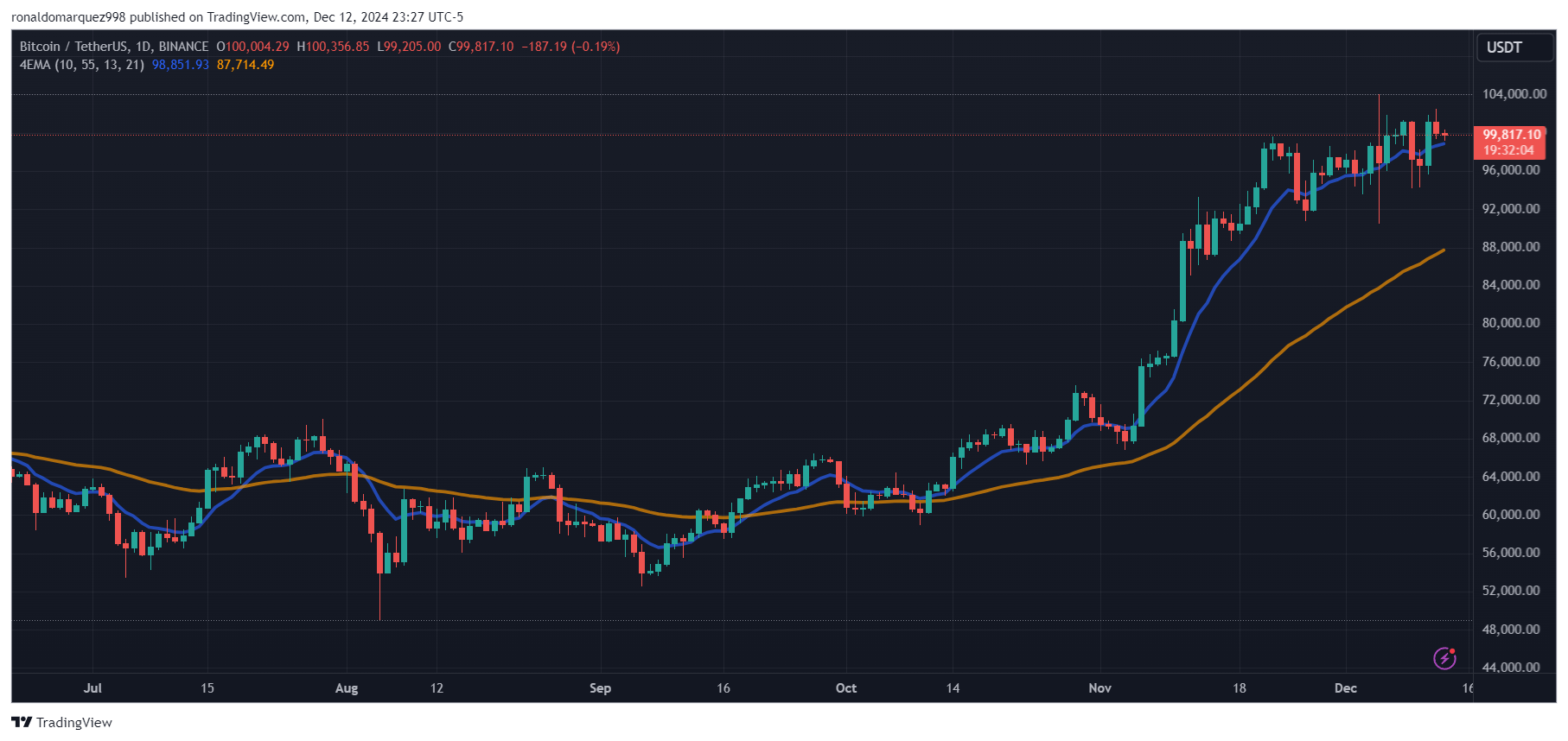 The day by day chart reveals BTC’s value drop under the $100,000 mark on Thursday. Supply: BTCUSDT on TradingView.com