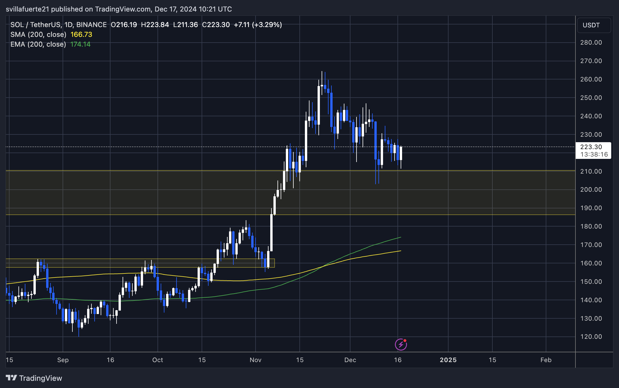 Solana (SOL) has been holding regular above an important demand stage close to $210, a key space that would ignite a large bull run. After reaching an all-time excessive (ATH) on November 22, Solana has skilled a 23% retracement, testing investor confidence. Nonetheless, analysts stay optimistic, with many anticipating a big upward transfer within the coming weeks.
