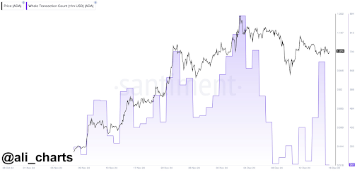 In line with information from the on-chain analytics platform Santiment, this improve in exercise is especially notable, because the whale exercise had been declining because the starting of December. Notably, Cardano whale exercise declined from about 894 transactions on December 2, simply earlier than it reached its present 2024 peak of $1.3, to round 240 transactions between December 8 and December 12.