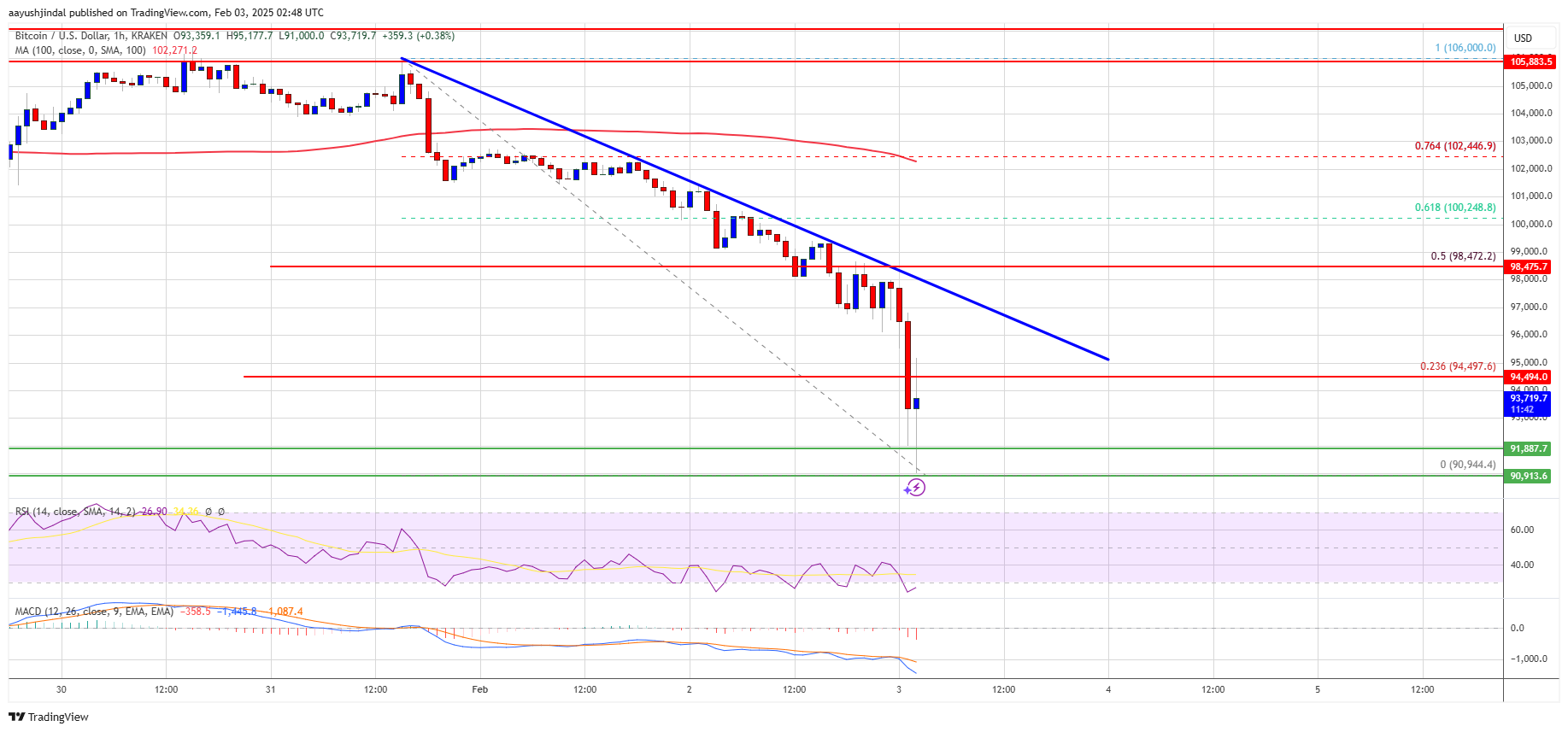A low was fashioned at $90,944 and the value is now consolidating losses. There was a minor improve above the $92,500 degree. The worth even examined the 23.6% Fib retracement degree of the downward transfer from the $106,000 swing excessive to the $90,944 low. Nonetheless, the bears are actually lively close to the $95,000 zone.