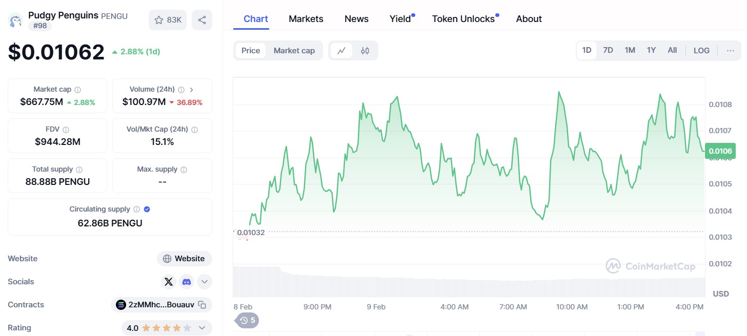 Pudgy Penguins is predicated on an NFT assortment by the identical identify. It’s a cutesy assortment of 8,888 penguin-themed cartoon characters, that means the token now derives its worth from group assist and cultural significance.