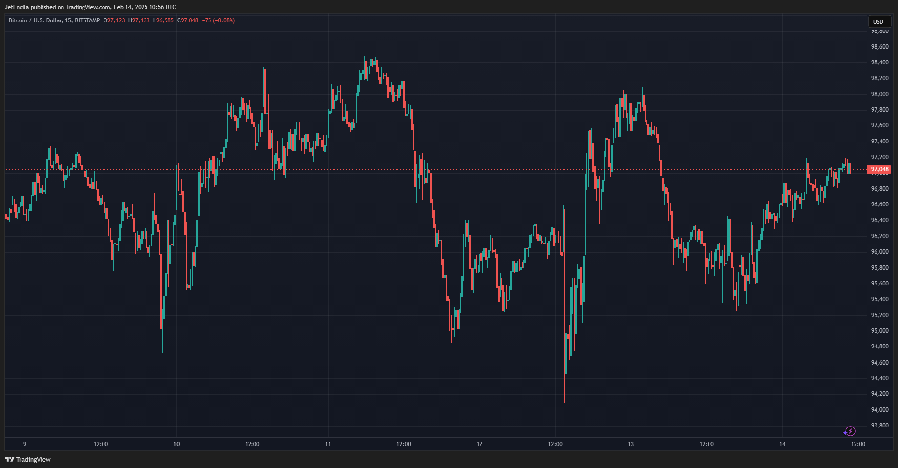 BTCUSD buying and selling at $97,035 on the each day chart: TradingView.com