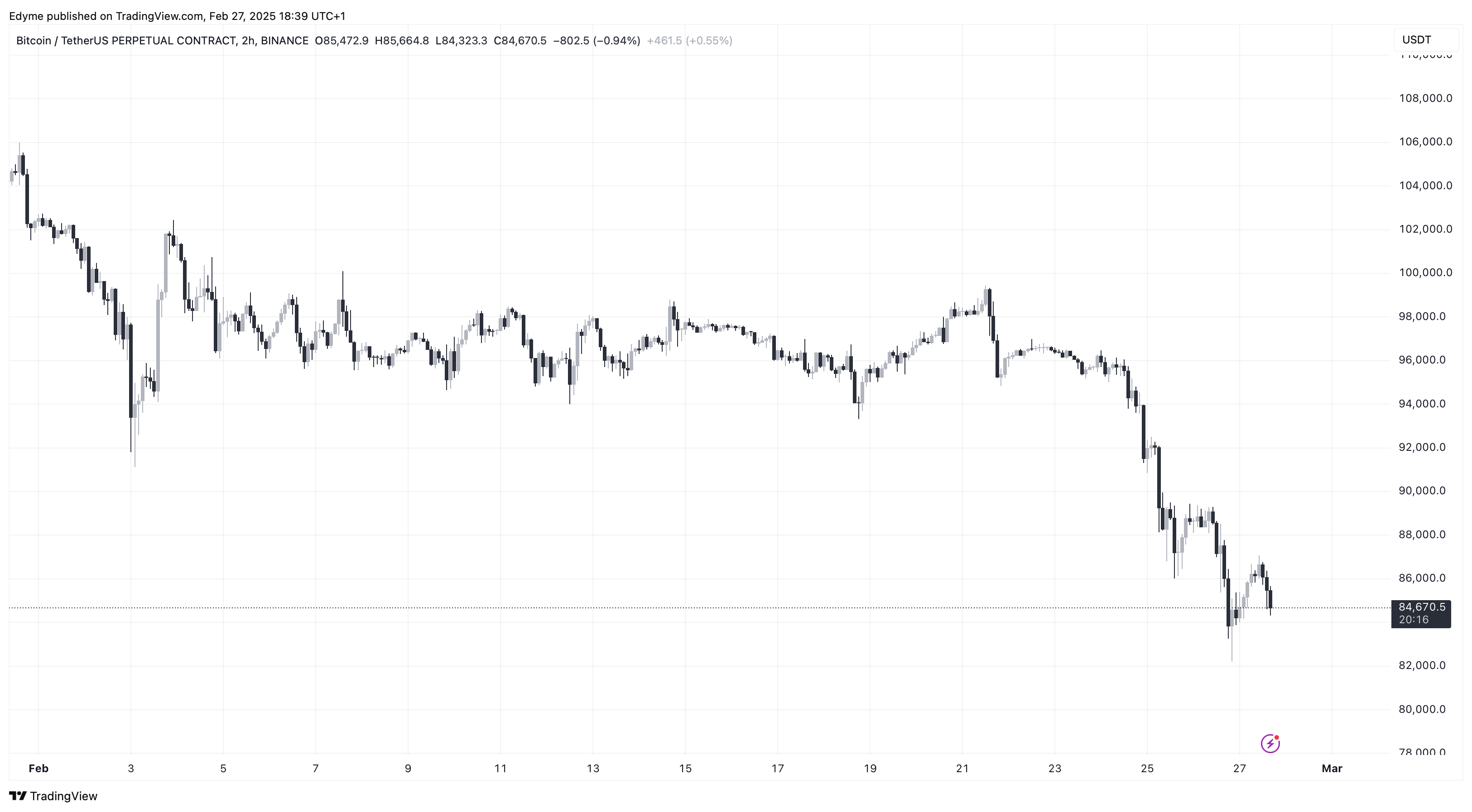 Bitcoin stays underneath strain, with its value dropping under $85,000. On the time of writing, Bitcoin is valued at $84,397, representing a 2.4% decline previously 24 hours and a big 13.7% drop over the previous week.