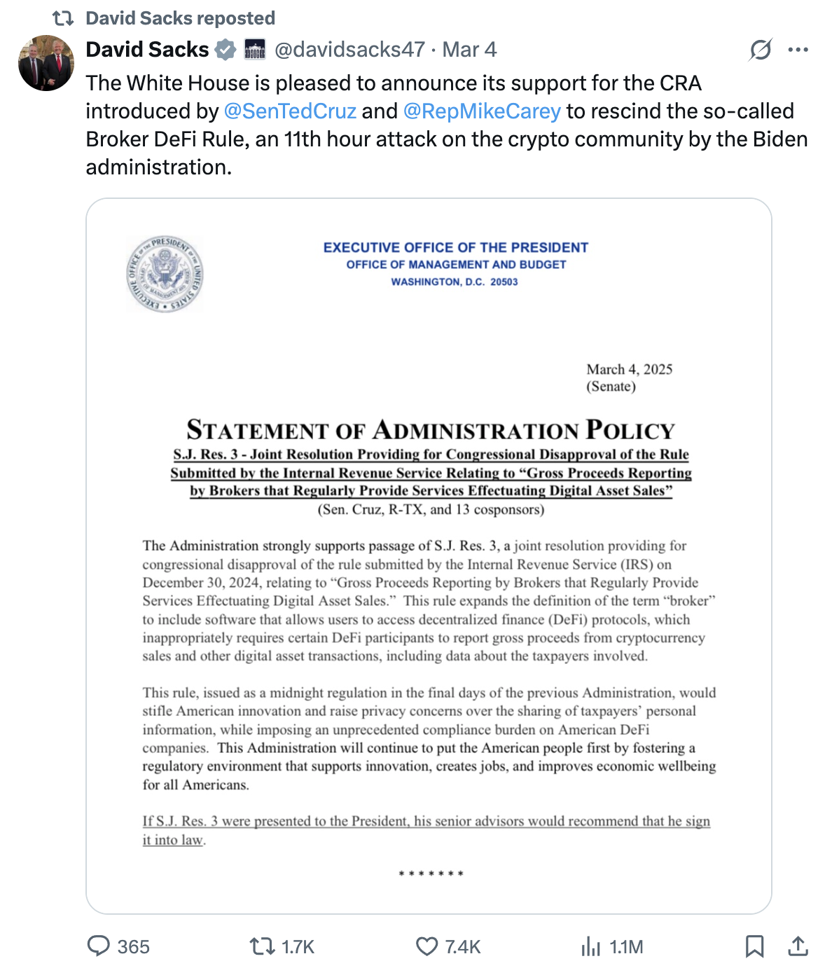 Whitehouse AI and crypto czar David Sacks additionally voiced the US administration’s help of repealing the DeFi Rule on his private X account. Now that the Senate has since voted in favor of this, it’s extremely probably that Trump – a serious advocate of cryptocurrency – will signal it.