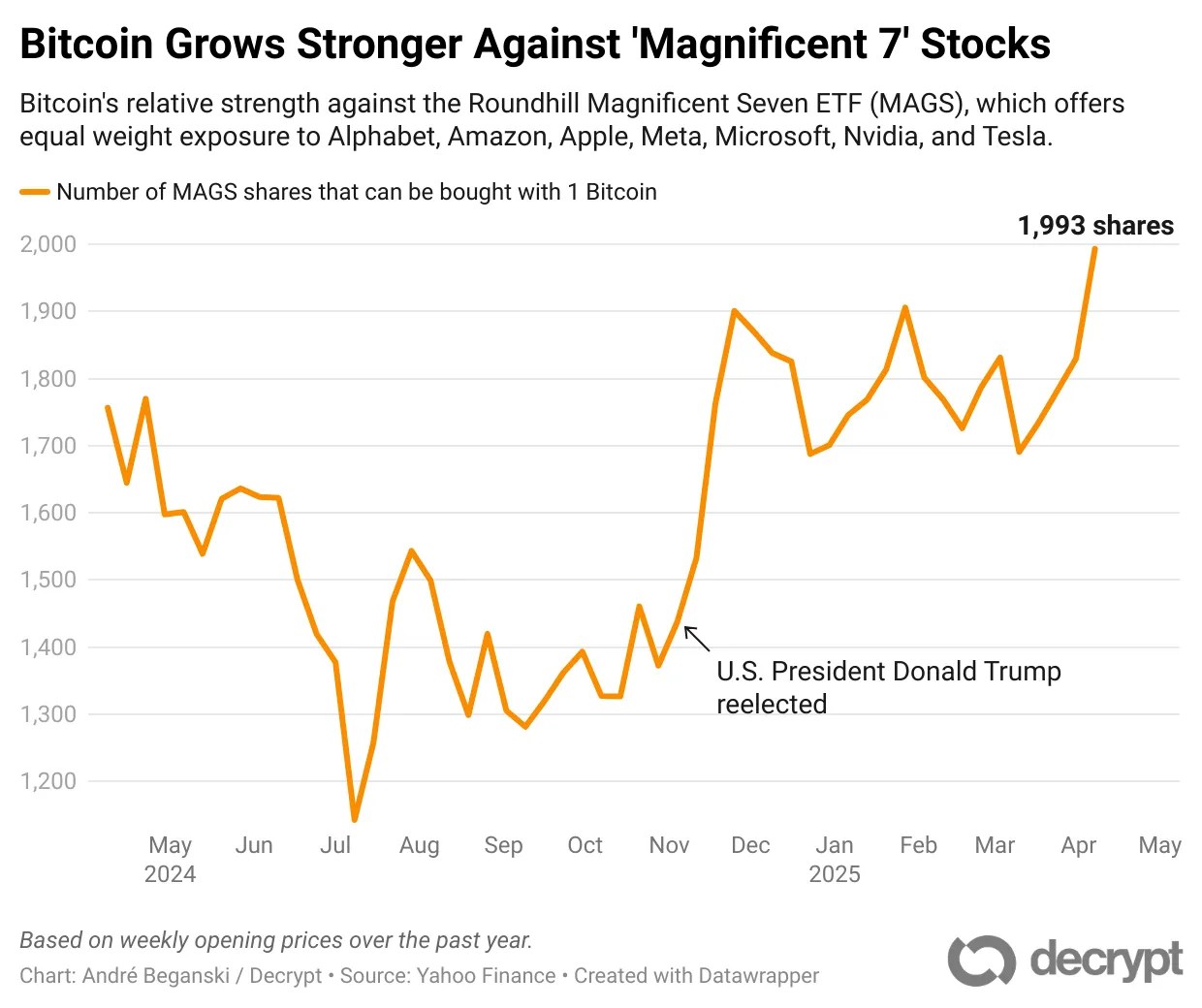 On Monday, one Bitcoin was price round 1,993 shares of the Roundhill Magnificent Seven ETF (MAGS), which affords equal weight publicity to the group of tech corporations. A yr in the past, one Bitcoin might’ve purchased 1,756 of the exchange-traded fund’s shares, when it was price $69,000.