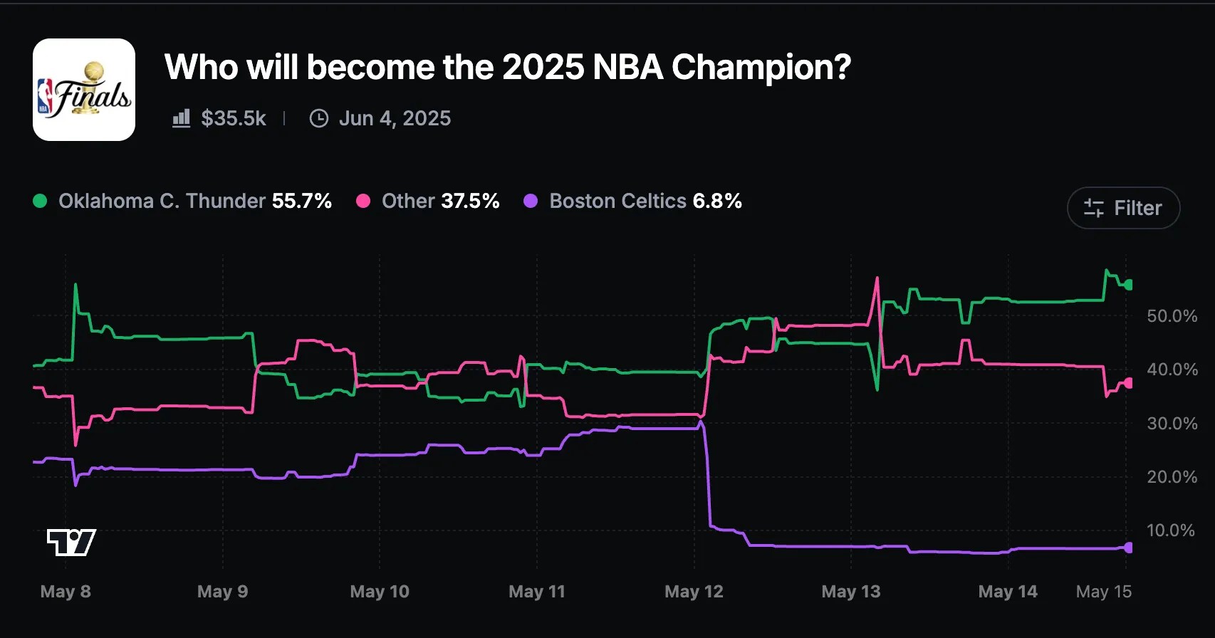 In final week’s replace, predictors on Myriad have been barely discounting the chances of the Oklahoma Metropolis Thunder or Boston Celtics taking the crown this 12 months when in comparison with conventional sportsbooks.