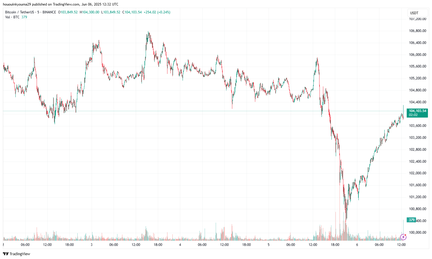As is seen within the graph, the Bitcoin value first went right down to a low of $100,400 from a excessive round $105,800 after which witnessed a restoration run again to $104,100.