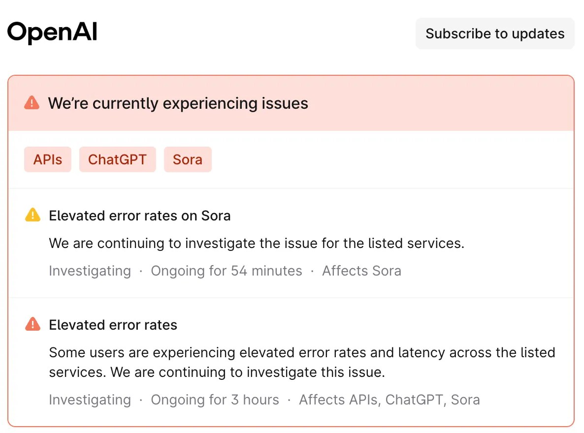 - OpenAI’s ChatGPT, APIs, and Sora video service have been experiencing a worldwide outage for 3 hours beginning round 3 a.m. EST, with solely Playground remaining purposeful.