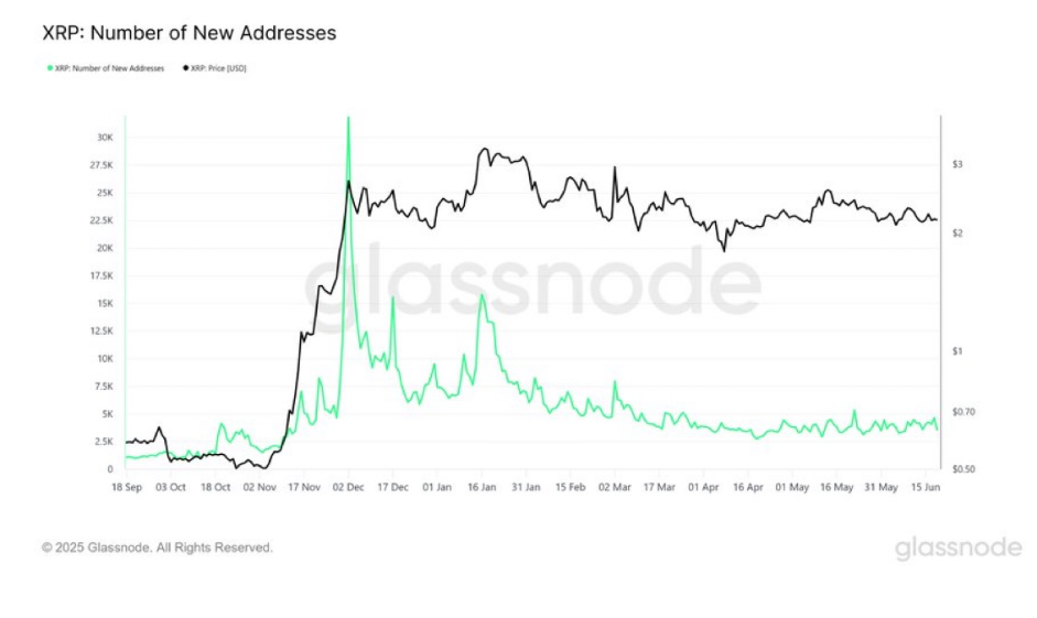 As of mid-June 2025, Glassnode chart reveals that new pockets creation has fallen drastically to round 2,000-5,000 per day, whereas day by day lively addresses plunged from 577,000 to simply 34,000. XRP’s worth, in the meantime, has settled simply above $2 and has remained largely range-bound, failing to indicate indicators of a sustained breakout.