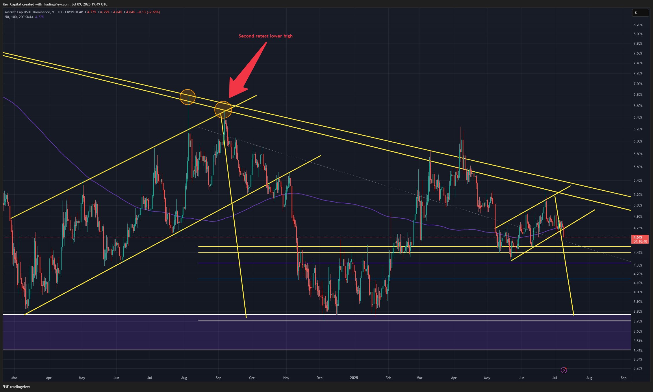 Kevin positioned explicit emphasis on the habits of Tether dominance (USDT.D), the share of crypto market capitalization held within the dollar-pegged stablecoin. The analyst displayed two long-term logarithmic USDT.D charts, every displaying an preliminary sharp decline adopted by what he described as a “rising channel slash bear flag.”