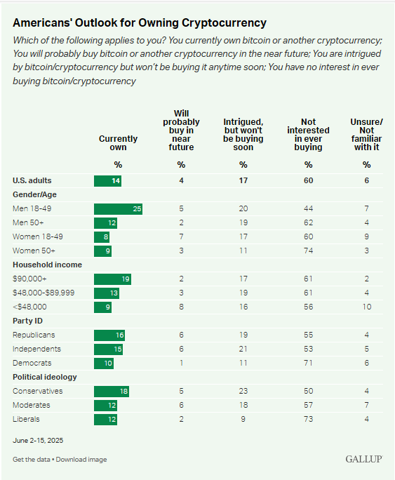 About 14% of US adults report proudly owning Bitcoin or one other sort of crypto at this time. That’s roughly one in seven individuals. Few others plan to leap in quickly. Simply 4% say they’ll most likely purchase it within the close to future.