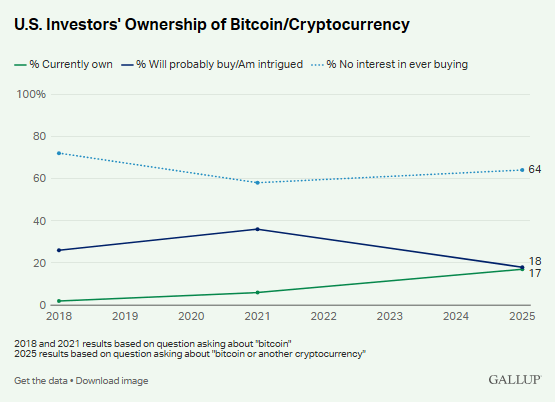 Proper now, solely 4% of adults identify crypto as the very best lengthy‑time period funding. Against this, about 60% personal shares or actual property.