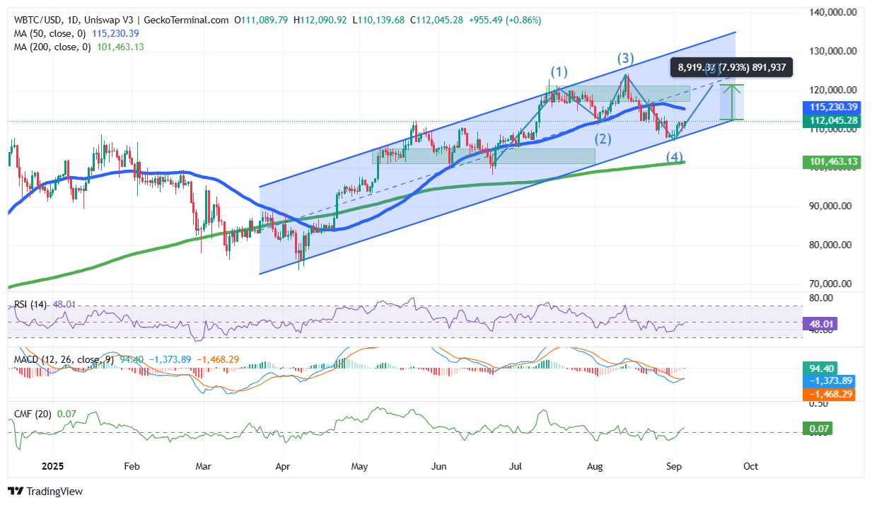 The BTC/USD chart evaluation on the each day timeframe exhibits that the BTC worth continues to commerce inside a well-defined rising channel sample, sustaining its long-term bullish construction.