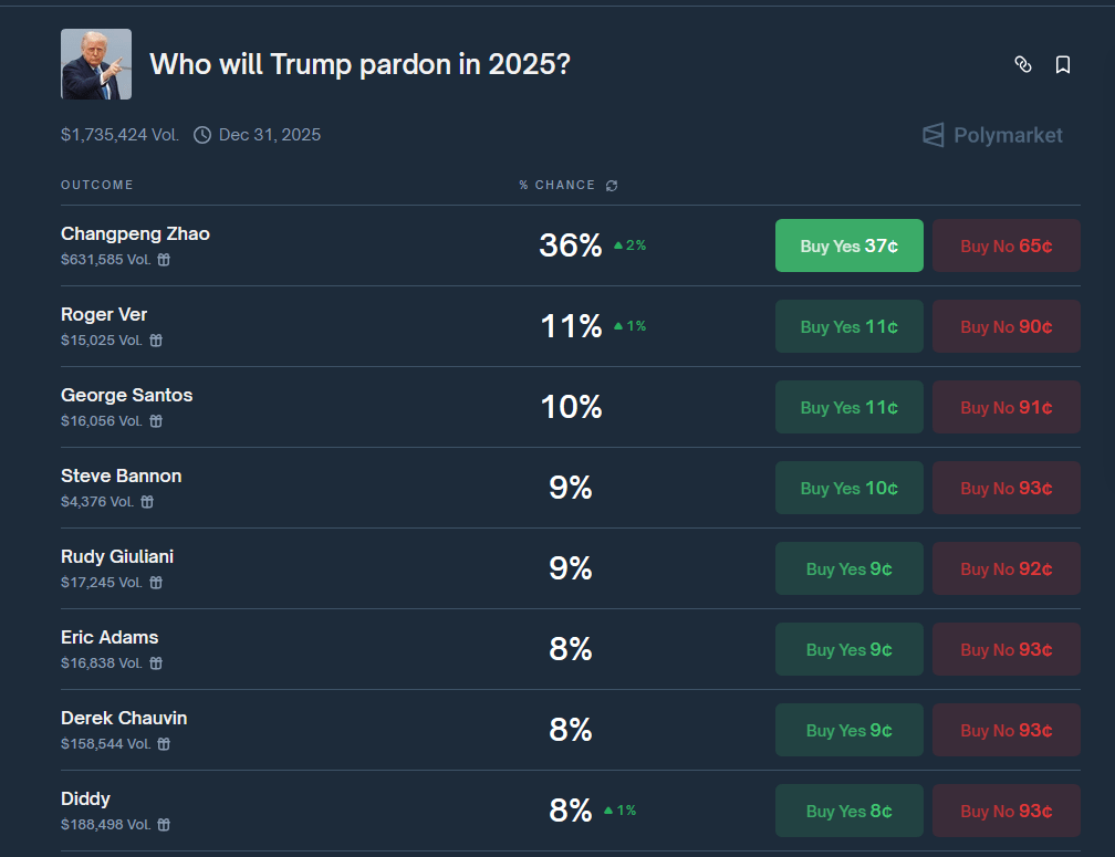 In line with a Polymarket ballot titled “Who will Trump pardon in 2025,” Changpeng Zhao is the favored candidate for a presidential pardon, drawing 36% of bets on the decentralized prediction web site.