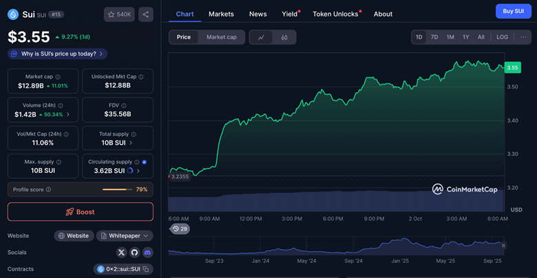 Sui (SUI) is buying and selling round $3.56 in the present day, and regardless of a $50 million token buyback introduced in September and its latest Robinhood itemizing, the bid stays cautious.