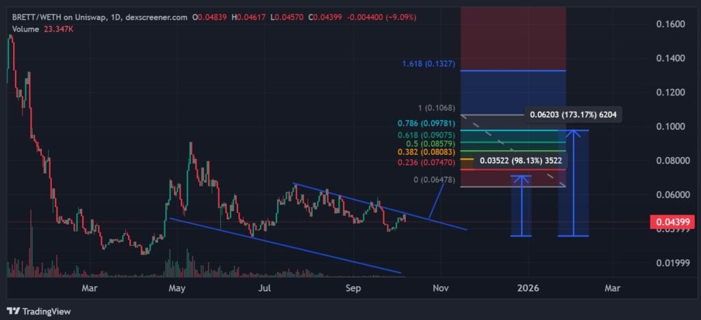Bitcoin’s volatility has weighed on Brett, dragging it decrease than many different meme cash. Regardless of the 40% pullback, the setup now favors long-term consumers trying to accumulate earlier than the following bullish reversal.