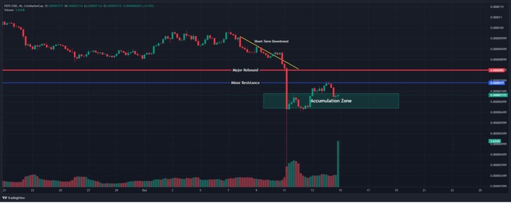Pepe is discovering robust assist throughout the $0.0000069–$0.0000074 accumulation zone after a 20% drawdown, holding above key short-term transferring averages on the hourly chart.