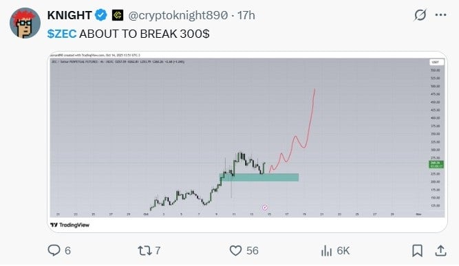Technical analysts share this optimistic outlook. The X account Knight posted that Zcash is “about to interrupt $300.” His TradingView chart exhibits ZEC consolidating in a key assist zone earlier than a potential breakout, with a projected rally that would push costs towards the $400 to $500 vary.