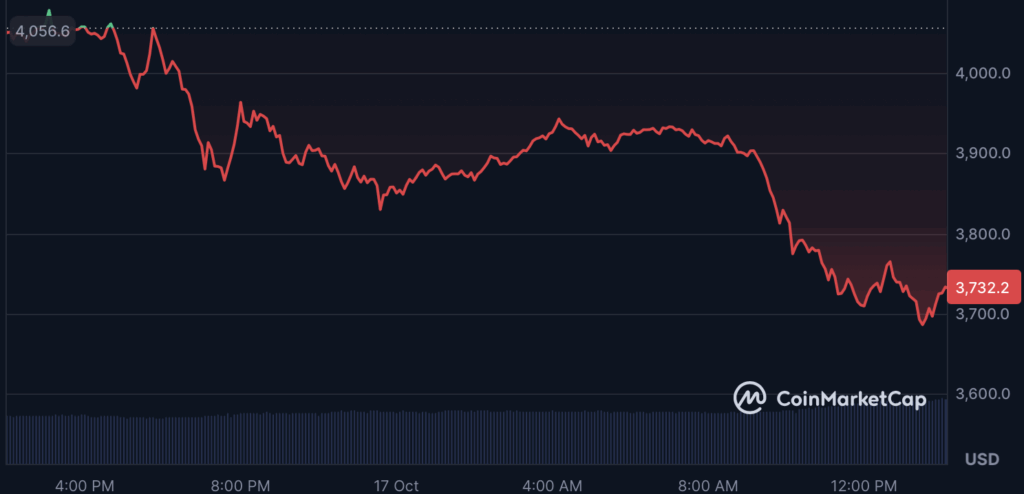 Ethereum (ETH) additionally dropped sharply, buying and selling at $3,715.72, down 8.36% over the identical interval.