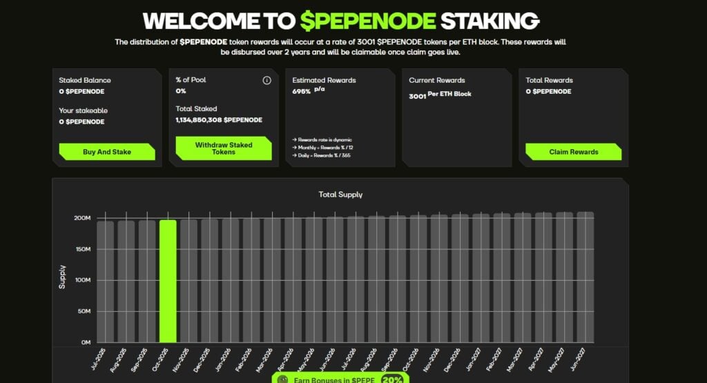 Considered one of Pepenode’s standout options is its as much as 700% APY staking program, a determine that shortly drew consideration throughout the meme coin group. Early contributors can begin incomes additional tokens even earlier than launch, permitting their holdings to develop steadily forward of listings.