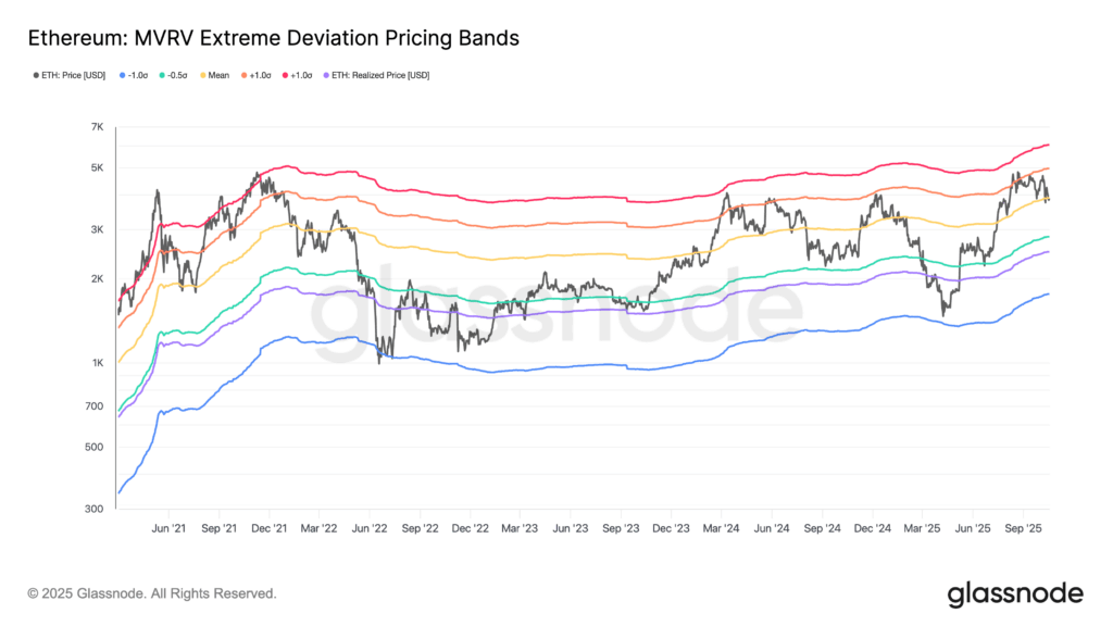 Including gasoline to the optimism, onchain knowledge from Glassnode reveals Ethereum’s MVRV deviation bands holding regular close to the imply at $3,900 – a stage that has repeatedly marked the beginning of latest rallies over the previous few years. Every bounce from this band has traditionally pushed ETH towards the higher deviation line, at present hovering round $5,000.