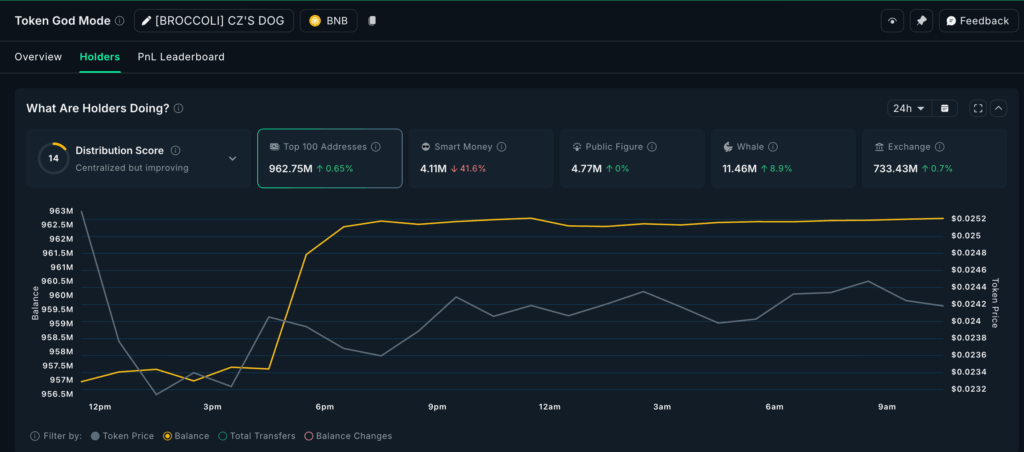 Whereas not a prime market cap token, BROCCOLI has proven exceptional stability amid broader declines. Whale holdings elevated by practically 9% prior to now 24 hours, with prime addresses including 0.65% extra. Momentum indicators, together with the Cash Circulation Index, level to rising accumulation moderately than panic promoting. A breakout above $0.027 may open a rally to $0.035 and $0.043, whereas dipping under $0.018 would point out additional weak point.