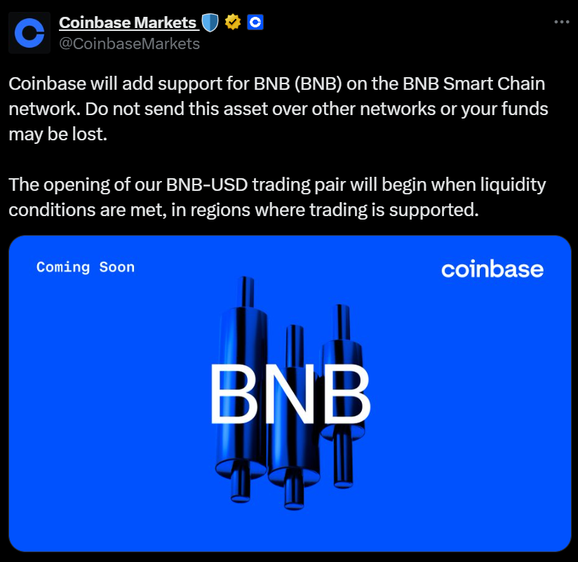 Simply hours after Robinhood (HOOD) introduced assist for Binance Coin (BNB), Coinbase (COIN) confirmed it’ll additionally checklist the token on its change, marking a serious second for BNB’s integration into the U.S. buying and selling ecosystem. Coinbase mentioned BNB-USD buying and selling pairs will go reside as soon as liquidity situations are met, with assist out there in areas the place buying and selling is permitted.
