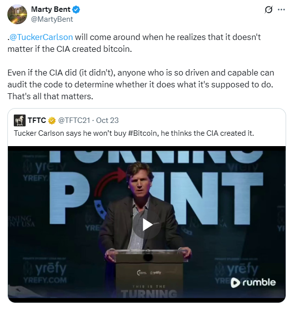 Crypto lovers and Bitcoin maximalists didn’t maintain again. Strike CEO Jack Mallers referred to as Carlson’s feedback uninformed, saying he utterly missed Bitcoin’s trustless nature — that it doesn’t matter who created it as a result of the code is open and auditable. Marty Bent, founding father of TFTC, echoed the sentiment, saying, “Anybody who’s succesful can confirm precisely what Bitcoin does. That’s what makes it stunning.” To many Bitcoiners, Carlson’s skepticism solely highlights how misunderstood the know-how nonetheless is exterior the crypto world.
