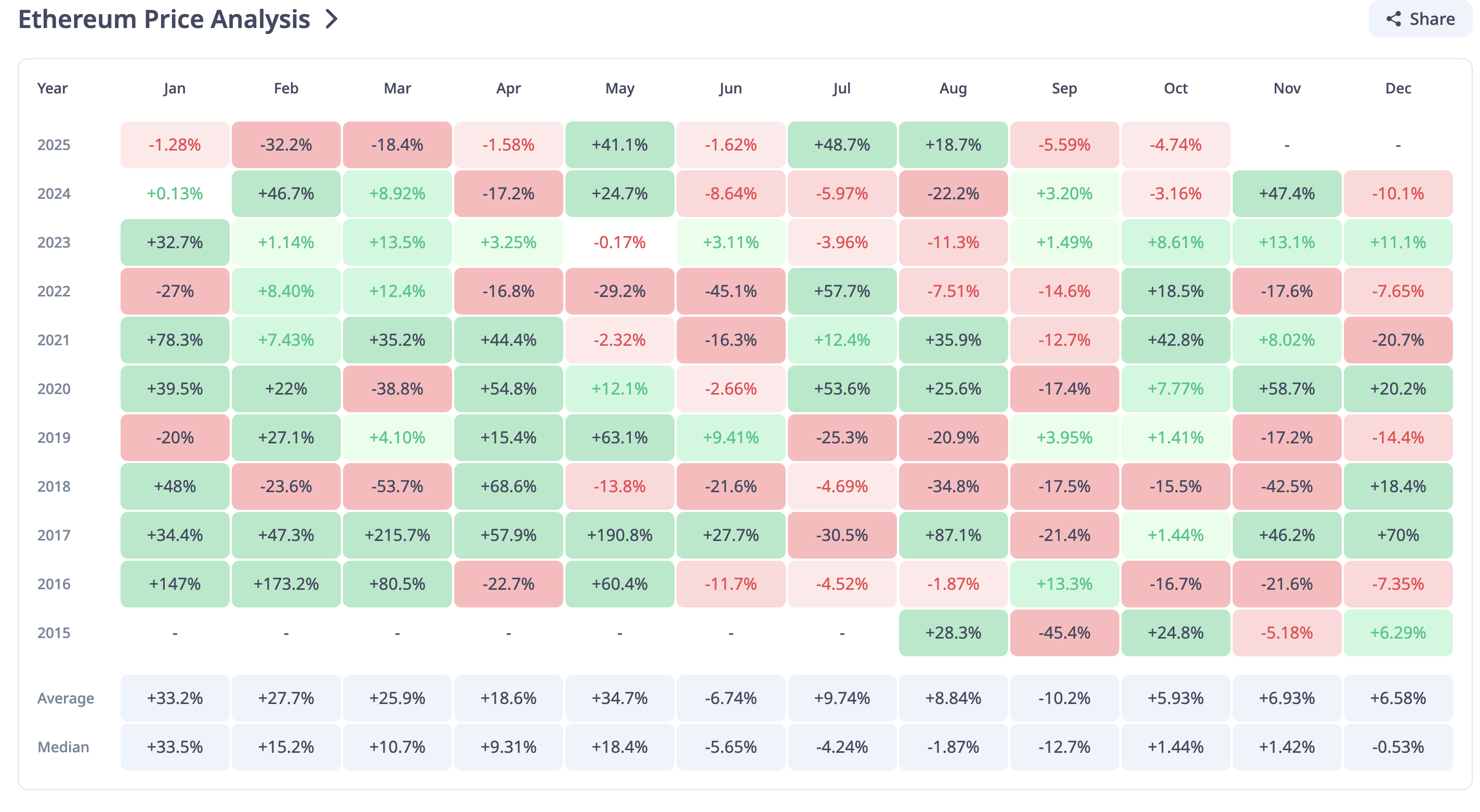 In Q2 of 2025, the Ethereum worth ended with a mean optimistic return of 36.5% and in Q3, it adopted with a 66.7% return, the very best thus far. With October trending low, there’s already a 4.83% decline this yr, however with greater than 2 months to go, there’s nonetheless time for issues to alter.