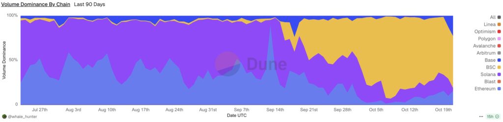 Because the chart beneath exhibits, Solana and Ethereum dominated the buying and selling bot market till September, when BSC unexpectedly took the lead. This is able to have left mono-chain bots struggling, whereas multichain bots like Snorter may adapt and preserve serving customers.