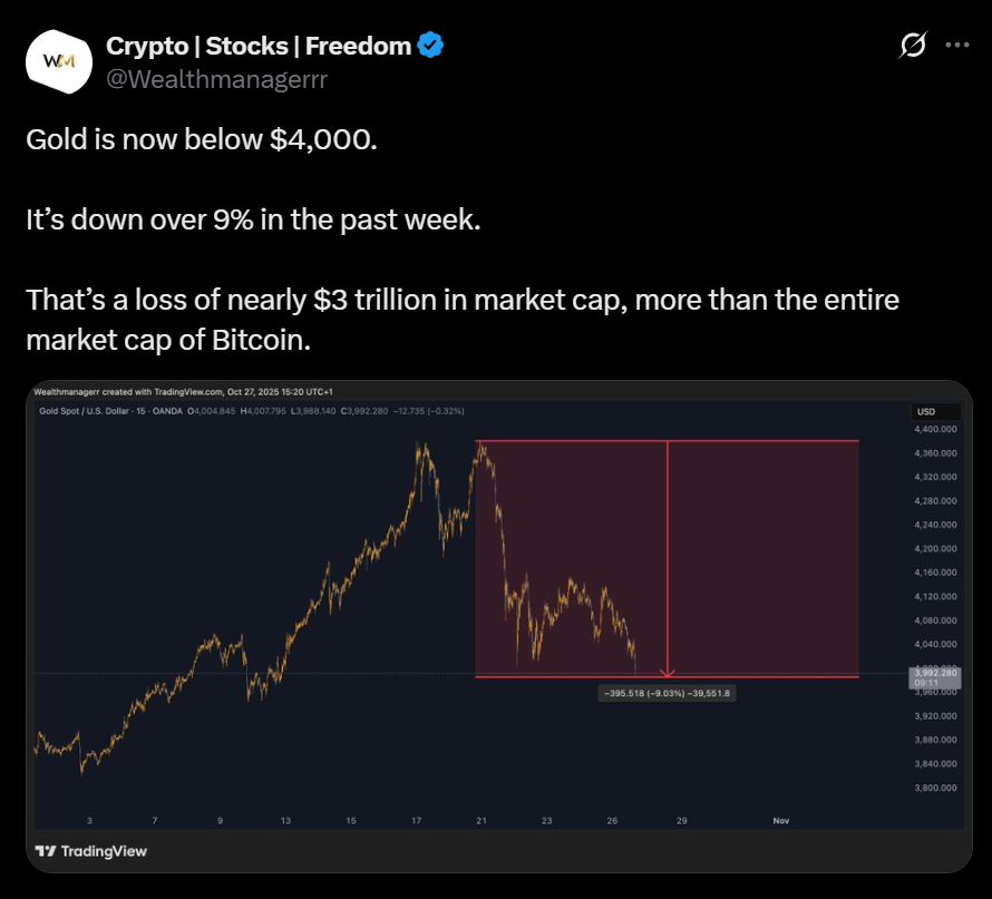 Technical merchants are eyeing two clear setups. A promote place from $4,150 is advisable with a goal of $3,970 and a cease loss at $4,200. Conversely, a purchase setup emerges from $3,980, concentrating on $4,200 with a cease loss close to $3,910. The market’s present construction reveals consolidation close to $4,000, indicating indecision as buyers await readability from macroeconomic occasions — significantly the U.S. Federal Reserve’s coverage announcement and a extremely anticipated U.S.–China commerce assembly that would shift international sentiment.