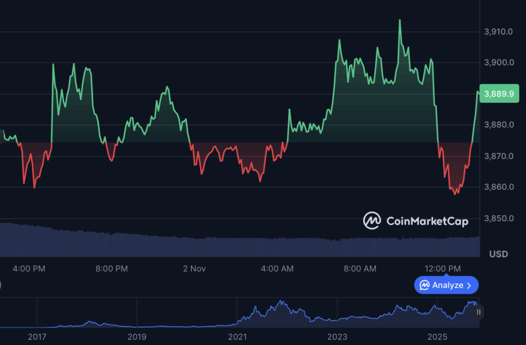 Ethereum (ETH) adopted an identical sample, gaining 0.53% in 24 hours to commerce at $3,892. The token’s weekly lack of 3.13% suggests merchants are hesitating to take aggressive positions forward of potential macroeconomic developments. Its market cap stays robust at almost $470 billion, protecting it firmly in second place behind Bitcoin.