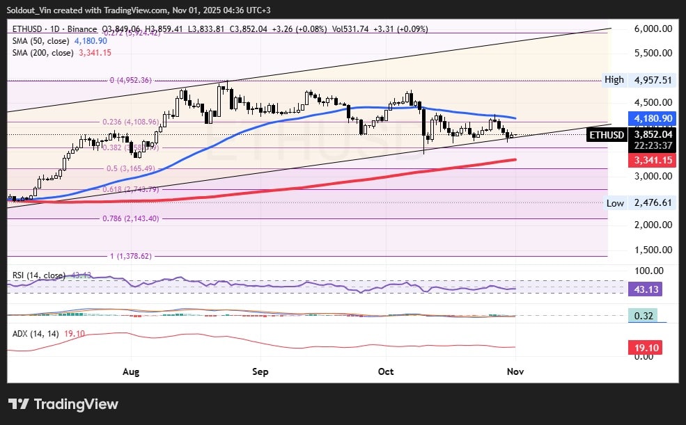 ETH has been largely range-bound between $3,700 and $4,180, with the 38.2% Fibonacci retracement at $3,852 performing as an essential pivot. If ETH can maintain above this stage, the following resistance sits close to $4,108 after which $4,180.