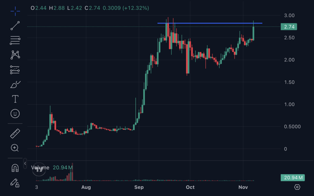 M is exhibiting vital bullish power. A weekly shut above the $2.82 resistance would invalidate doubtlessly bearish double-top eventualities and ensure the beginning of a brand new bull rally.