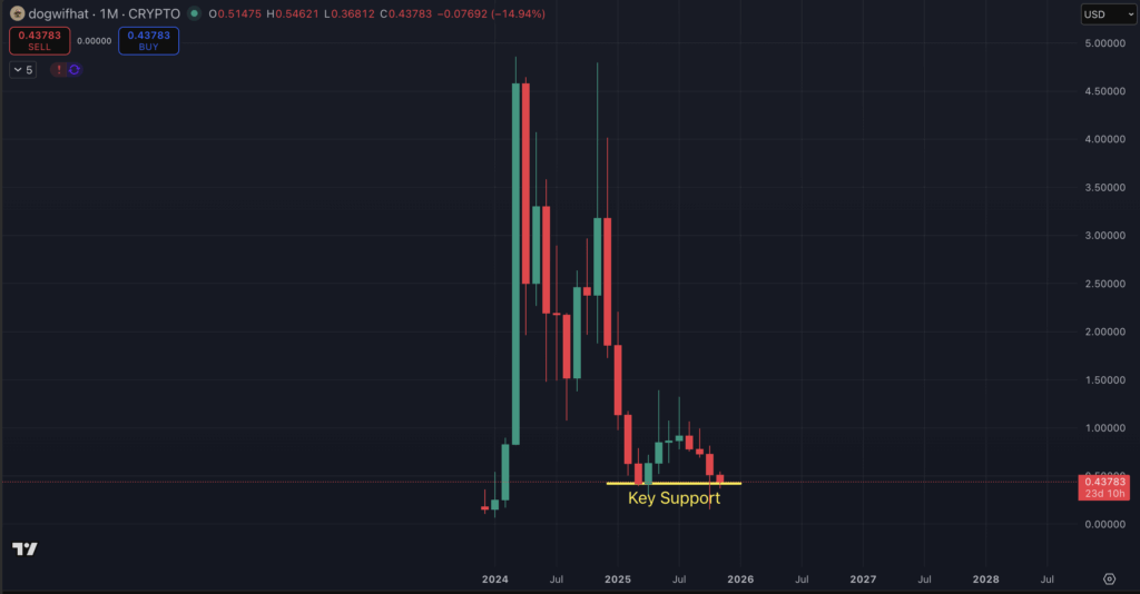 Notably, WIF is defending the important thing $0.42 assist stage. A weekly shut above it could create a double backside within the month-to-month timeframe, possible confirming the beginning of a brand new uptrend.