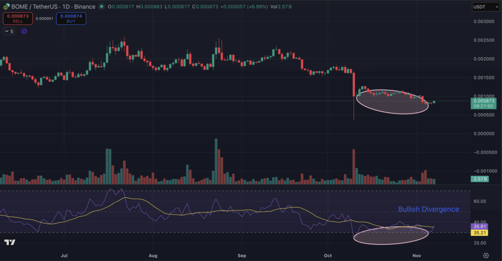 Notably, BOME has additionally shaped a bullish divergence with its Relative Power Index within the day by day timeframe, as evidenced by the decrease low in value and better low in its RSI.