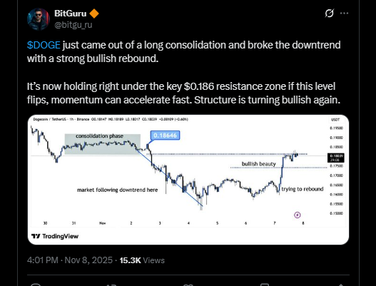 Proper now, DOGE is sitting slightly below a key resistance zone round $0.186. This degree is principally the road within the sand. If worth can flip that resistance into assist, the market construction leans again to bullish, and the narrative shifts from “random bounce” to “okay, this may be the beginning of one thing larger.”