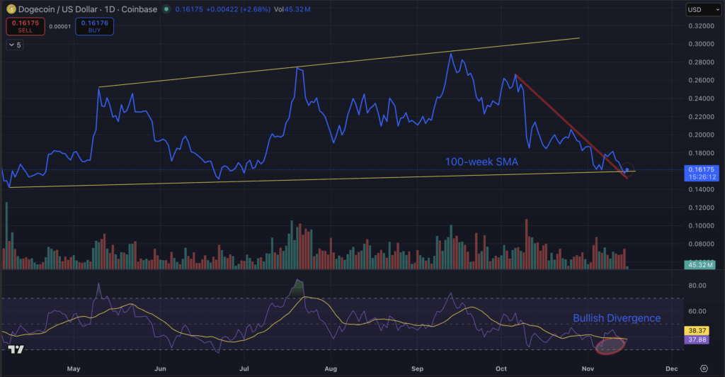 Lastly, Dogecoin has additionally shaped a bullish divergence within the each day timeframe, as evidenced by the current decrease low in worth and better low within the Relative Energy Index (RSI-14).