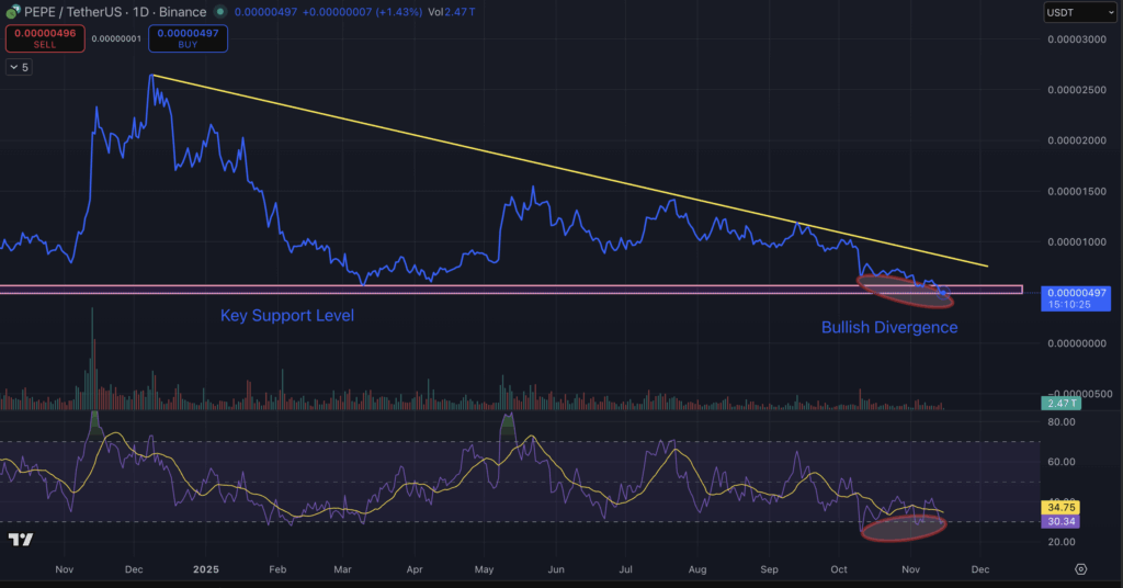 Nevertheless, it has now shaped a bullish divergence, proper at a key assist stage. The Pepe worth continues to kind decrease lows, whereas its Relative Energy Index is making increased lows.