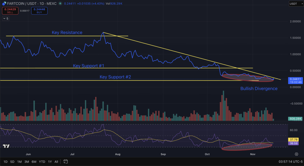 As evident within the above worth chart, Fartcoin has shaped a bullish divergence in its each day timeframe, evident within the lower-low worth and higher-low RSI.