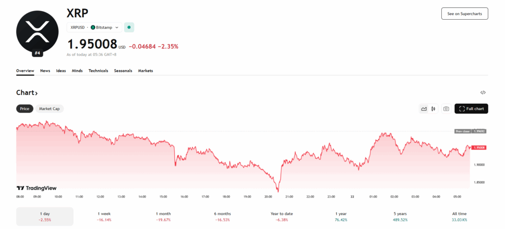 XRP additionally dropped sharply, falling from $2.50 all the way down to $1.96 on the time of writing. The dealer entered lengthy at $2.30, leaving that place underwater as properly. XRP’s double-digit correction contributed closely to the revenue wipeout, with the asset dropping greater than 18% over the identical interval.