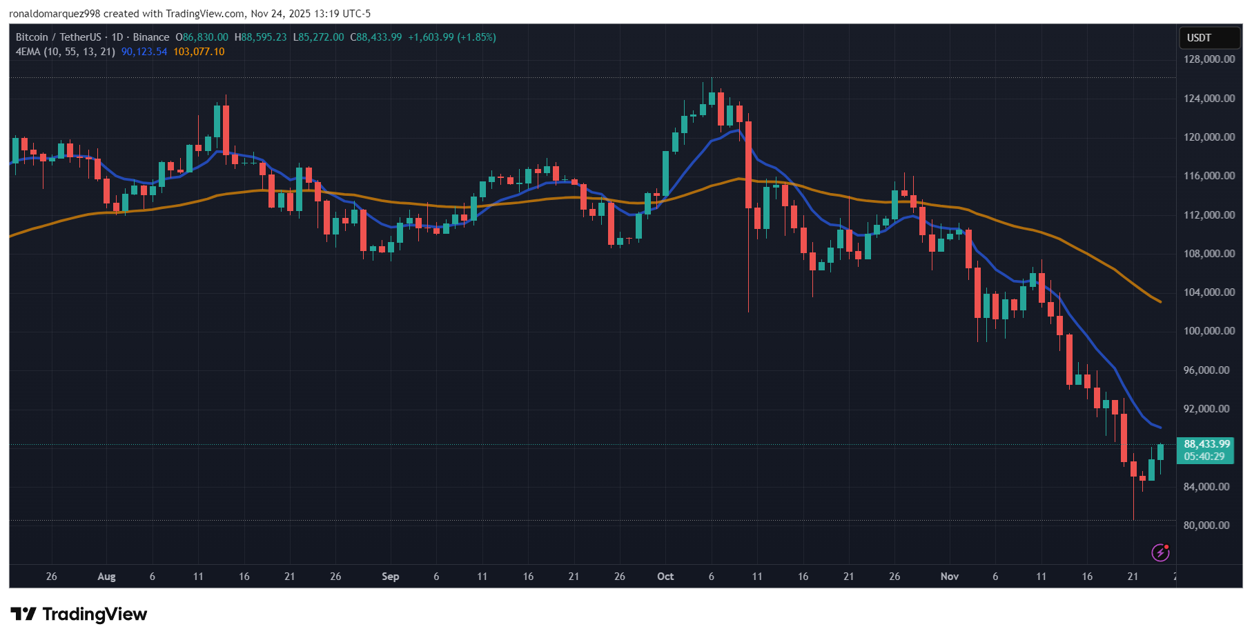 At present, the market’s main cryptocurrency has seen a 1.5% restoration on Monday towards $88,430, after reaching an 8-month low of $80,000 final Friday. This positions BTC almost 30% under all-time highs of $126,000 reached again in October.
