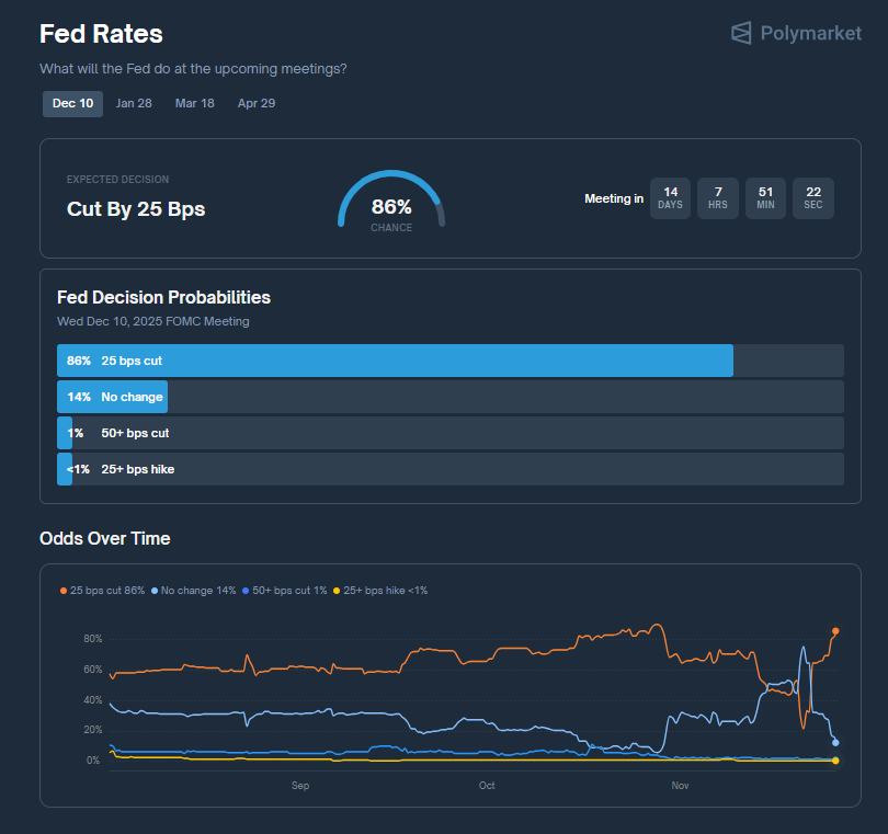 Markets, nevertheless, aren’t ready. Polymarket now exhibits merchants pricing a 86 p.c probability of a 25-bps lower in December. Traders seem satisfied Powell will act, regardless that the lacking knowledge usually would’ve been the final main enter earlier than the Fed’s last determination of the 12 months. In a wierd twist, much less data is definitely pushing rate-cut odds larger, as merchants assume Powell received’t danger tightening circumstances throughout a softening labor stretch.